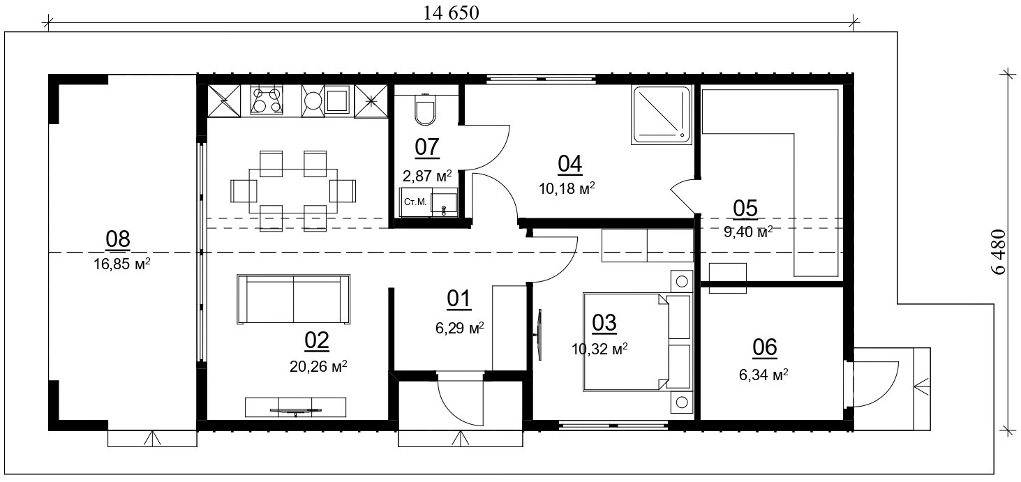 Одноэтажный дом-баня, созданный по каркасной технологии, сочетает уют и функциональность. Просторная терраса для отдыха, тёплая кухня-гостиная, где соберётся семья, парная для расслабления и комфортная спальня создают идеальное пространство для жизни и загородного уединения.